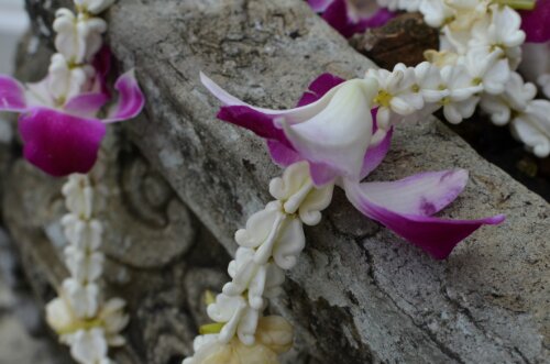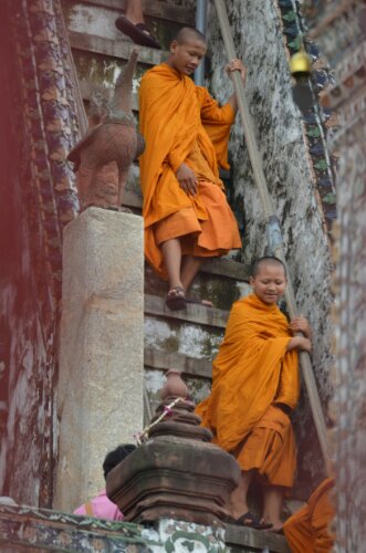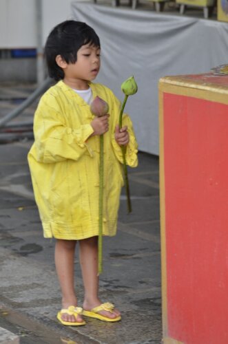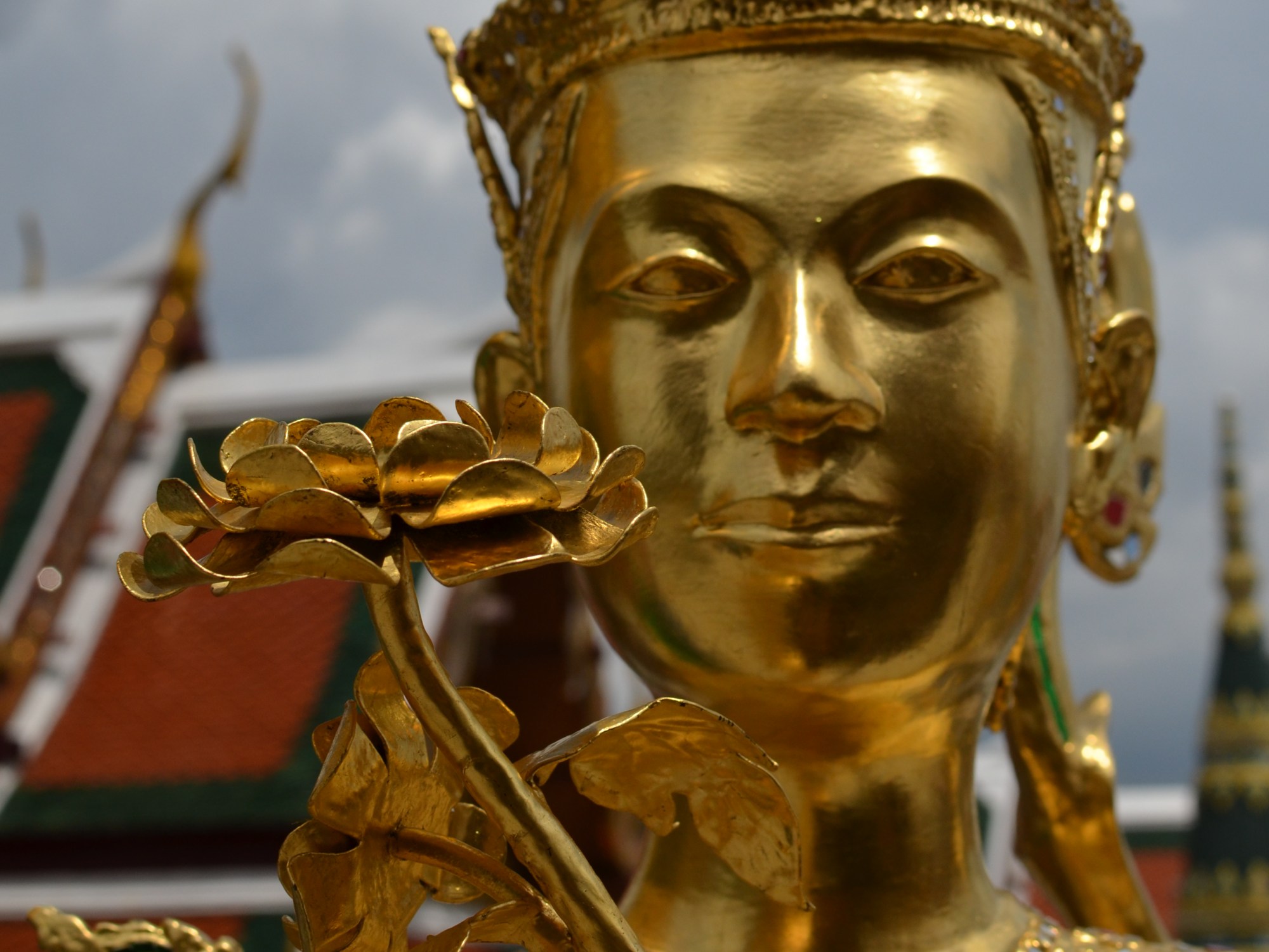 Devotees seemed to be bringing beautiful lotus flowers, garlands and in some cases food like eggs. They lit candles and incense and peeled tiny pieces of gold leaf off its paper backing before attaching it to a Buddha of their choosing. Chanting (unusually by a group containing women as well as men) filled the space, peppered occasionally with the chimes of tiny bells.