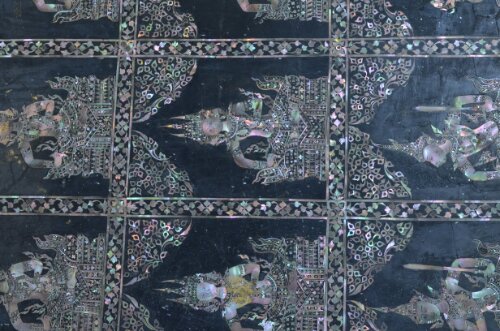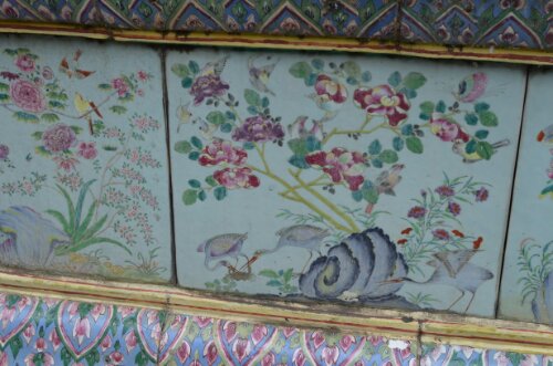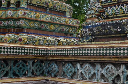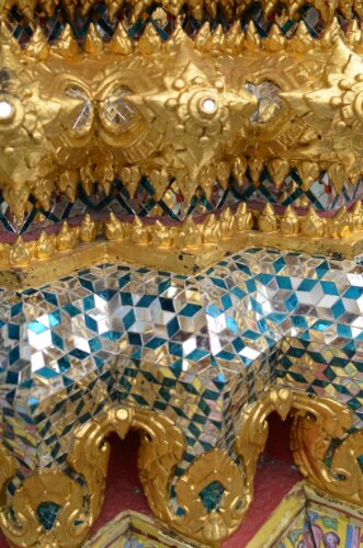 The grounds consisted of loads of buildings. Without a guide, we don’t really know what they all were, but I guess there was everything needed for life at the palace plus stupas containing royal remains and sacred relics. The building exteriors were impressive. Every inch was covered in large intricately painted tiles or tiny colorful mosaic tiles, mirrors, jewel-like pieces and gold. We didn’t go inside many buildings but those we saw were equally, if not more highly decorated.