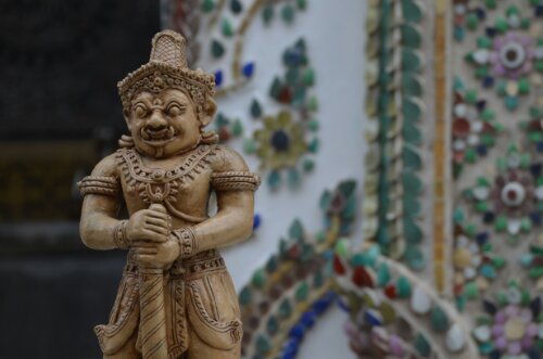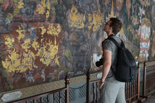 The complex is famed for housing Wat Phra Khao – the temple of the Emerald Buddha. He was a tiny little chap (66cm) perched atop an enormous (we’re talking 6m I’d say) gold and jewel-encrusted platform. Shoes had to be removed before entering, photographs weren’t allowed and all the devotees knelt before him to pray.