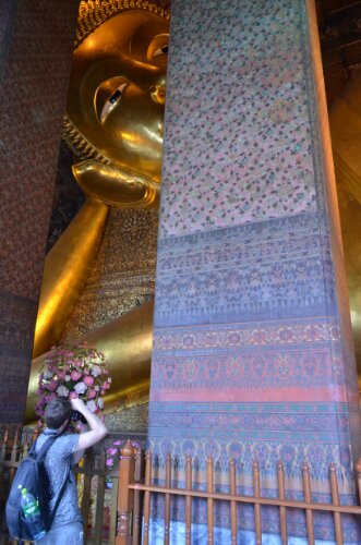 Of course we didn’t just ride around on public transport all day for the fun of it, we had a packed day visiting some of the most important Bangkok sights. First up was the Grand Palace (a gift from Vicki, thank you!) which was situated in a temple complex surrounded by huge white walls. A repeated announcement incongruously played some cheesy big band music as if it was the entrance to a fairground. Everyone had to have completely covered legs and shoulders; I’d prepared for this by bringing an extra top but hadn’t accounted for having to wear it around the grounds as well as in the temples.Consequently I, with hundreds of others, spent the day uncomfortably melting in the blazing heat.