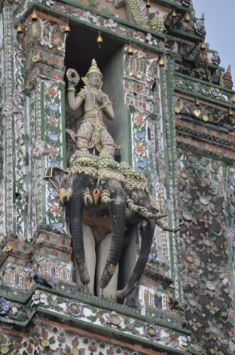 Next we boarded a ferry (3 Baht each) driven, it seemed, by a tiny waifish girl of about seven whose long hair whipped about in the breeze. Really I think her dad may have had his hand on the rudder. The five minute ride took us to the magnificent Wat Arun which is covered in sculpted gargoyle-type beings, elephants and various other more complex details. We decided not to pay to enter these grounds especially since the main activity is to climb very high up some riduculously steep and freshly rained upon steps. So we wandered around the outside (papping some orange-robed boy monks as discreetly as possible) to admire it before re-boarding the ferry and heading to our aforementioned frustrating journey home.