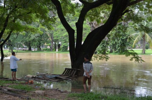 The river ready to burst its banks and the street our hostel was on: