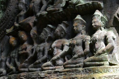 Unique because of 54 gothic towers decorated with 216 coldly-smiling enormous faces of Avalokiteshvara which look quite like the king who built the temple. It stands in the exact centre of the city of Angkor Thom. There are 3 levels, 2 square and the top one circular. It was built a level at a time because the aging king didn’t know how much he’d get done before he died! There are 11,000 figures in the 1.2km of bas reliefs.