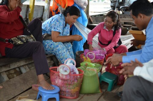 First we got a small ‘ferry’ across the river to an island. It was a long wooden boat with a motor at the back, covered partially by a tarpaulin for a roof, and it filled up gradually with local people with their polythene bags of cockles, bolts, cigarettes, meat, garlic, rice pudding and an array of fruits and vegetables. When the boat was full enough, a motorbike was brought on at the front and we departed. It cost 1000 Riel each (about 15p).