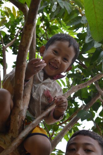 Further on a man in just his boxers appeared from the trees concealing the river; he had with him a few fish he’d just caught and a slightly sheepish grin. Best of all, we spotted three little boys monkeying around up a fruit tree! We stopped to take their picture and they were delighted to see themselves on the screen. It’s moments like these that are my favourite part of travelling.