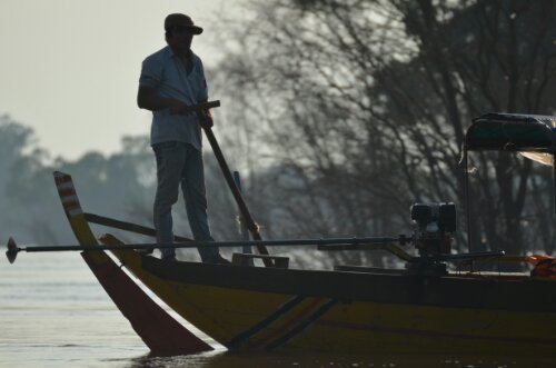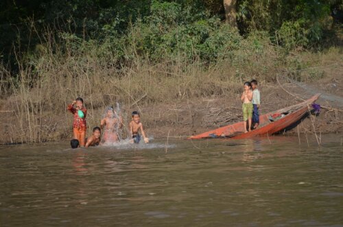 After this, we headed back to Kratie for a much needed shower and some lunch before reconvening with Tanja and Denise for our second activity of the day. A 15km tuk tuk ride through lots more rural village life took us to an area of the Mekong where it’s possible to get a dolphin-watching boat.   By this time it was about 4pm so our wooden boat’s tarpaulin didn’t give us much protection from the sinking sun. The boat owner motored us over the perfectly still river for a while, passing fishermen and kids playing, until he got his first glimpse of the small pod of dolphins.