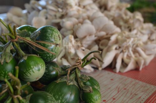 Our first stop was Luang Nam Tha’s market where the driver bought food for the evening meal while we wandered around looking at an array of raw meat including dead squirrels, an alive but expensive bamboo rat, not quite dead enough fish, fruits, herbs, vegetables and the gelatinous stuff used for making noodles.