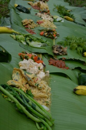 About half way, we stopped in a clearing for a unique lunch experience. While we washed our hands in the river, one of the local guides disappeared and returned a few minutes later with an armful of giant banana tree leaves. These were laid out on the floor in the manner of a long table and benches. Si then unwrapped and tipped out various foods along the length of the ‘table’ and laid places for each of us marked by a banana and banana leaf full of sticky rice. There were stir fried vegetables, bamboo with rice noodles, omelette, tofu, aubergine with pork and green beans. Of course, all were immediately seasoned by a plethora of flies, ants and spiders!