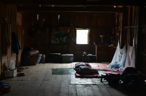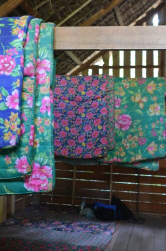 Lao Li’s wooden house was raised off the ground by about 2.5m and this area was used to store goods and vehicles and as a sheltered space in which to work. I’d estimate the main storey of the house to have been approximately a rectangle of 12m x 6m. At one end was a hearth with room for two fires and everything in the way of pots, pans, knives and food required for cooking. The opposite end housed the tv and stereo (!) as well as an area for offerings to the spirits since, like most tribal groups in Lao, the Lantens practise animism. Built into two thirds of one of the long walls were four bedrooms, and then there was another (Lao Li’s) tacked (literally it seemed!) onto the outside of the main house next to the balcony/porch area.