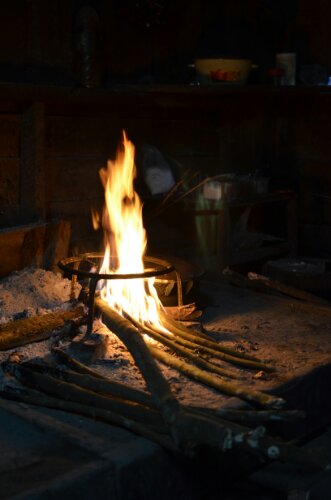 Afterwards, we (well, the men of course) tried, with varying degrees of success, to keep our camp fire going with what little dry wood and leaves that could be found. Huddled around it for warmth, we chatted for a couple of hours and admired the clear starry sky. Then we headed inside to our beds. These were very thin mats on the floor and thick, coarse blankets under mosquito nets suspended from the hut’s rafters. It was way too cold!