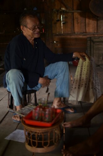Given the fairly frosty welcome to the village, we weren’t sure what to expect from the family but they were absolutely lovely and, although none had any English and didn’t seem to even know Lao, they were very smiley and seemed to appreciate us learning ‘thank you’ in their tribe’s language: oh my baa! Lao-Li is 70 and has been the village shaman for 50 years. He (unusually) had two wives because the first couldn’t have children; she chose the second so she would get along with her. Both have now died so he lives with his two children, their spouses and three grandchildren.