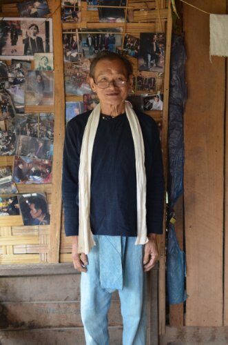 Si directed Dean and I back to a house we had already visited whilst he dispatched the rest of the group off back to Luang Nam Tha. There we met our host, Lao Li (pictured below in his traditional dress), who didn’t speak any English at all but managed to suggest to us that we go and take showers. More private than others we’d spotted around the village, this was basically a tap shielded from the path (but not the pig sty though fortunately they showed very little interest!) by a low roof and two walls made of woven bamboo. A pair of ducks were drinking from the pool of water below the tap and there was a plank to stand on. As it is shared by several families and is not very private, men wash wearing their underwear and women wear a kind of sarong sewn closed. This is how everyone washes in the river too. It was harder than I imagined, especially getting dry at the end whilst wearing a soaking sarong! Quite the experience!