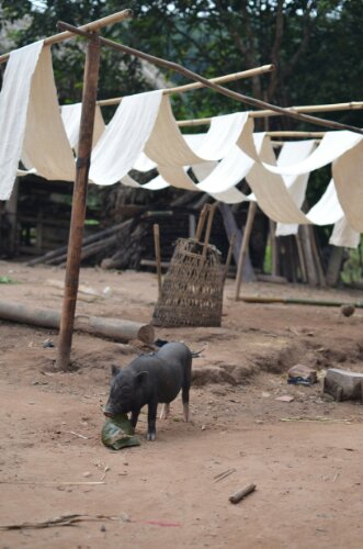 Piling into the minivan, we travelled a few kilometres to the village of Nam Lue, home to 235 Lanten tribespeople, where Si, Dean and I would be spending the night. We took a stroll, amongst the pigs, chickens and puppies, looking at what the villagers were doing, not feeling particularly welcome it has to be said, while the raggedy children crowded round the little Australian in awe.