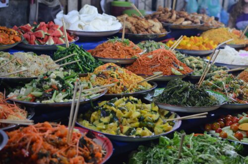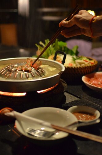 First a gloved waiter brings a bucket of fire to your table (you’re sitting on the floor on cushions so this is at chest height), removes one of the ceramic tiles on the surface and places the fire under the table. On top they put a metal cooking pot consisting of a moat and a mound in the middle. Into the moat, a metal kettle of coconut water is poured which begins to simmer. You add an egg (pierced top to bottom with a chopstick so the contents can be dribbled around the moat), followed by noodles and vegetables (mushrooms, cauliflower, various greens, carrots and so on). Then on the mound, using chopsticks, you rub a piece of fat then lay on thin strips of your chosen meat (we had pork) which sizzle away. Once the soup is bubbling and the meat is cooked, you serve yourself a portion into a small bowl and eat in the traditional way of chopsticks in one hand and a small metal ladle in the other, season with chilli and garlic and dig in! Nutritious and delicious!