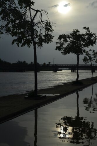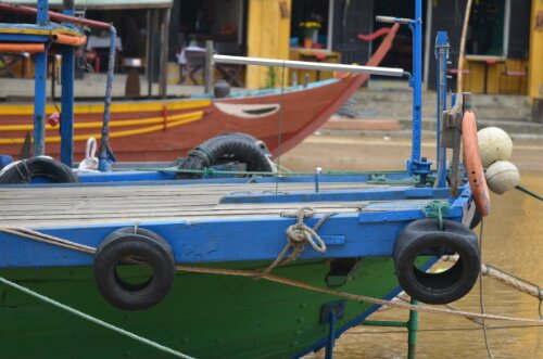 People remain calm but have stopped their daily activities to focus on protecting themselves and their property from the typhoon. Some methods we saw as we wandered earlier: strips of tape over windows; large potted plants laid on their sides; wood or metal poles attached across the front of shops; branches cut down from trees and wooden struts propped up against them for stability; reinforcement of fixings holding shop signs and other things which couldn’t be taken down; people pinching sand from building sites; ATMs removed; boats secured to concrete blocks with lots of ropes; lanterns taken down and plants moved indoors at our hotel. Lots of restaurants and shops, particularly along the river are closed. The people doing nothing are the most concerning because if they don’t secure their roof panels and pots and signs and so on then they could do someone some serious damage if Philippines news reports are anything to go by.