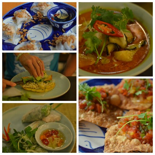Clockwise from top left: white rose (pork and shrimp dumpling), vegetable curry, vegetable wanton, fresh pork spring rolls and a Hoi An crispy pancake being rolled for Dean. We’ve also tried Cao Lau several times which is a Hoi An noodle dish.