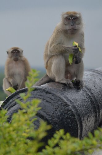Lastly we took a walk up a hill where there were yet more monkeys (same as before plus some macaques) being fed by tourists who wanted photos with the monkeys sitting on their heads. The incongruous image of monkeys eating bananas whilst sitting on canons amused me!