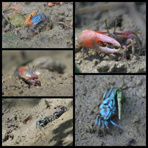 There were also crabs. Probably thousands (15 species apparently), living in mud holes. Some were big and ugly but there were also lots of colourful little ones, particularly the male fiddler crabs who have one much larger pincer in a contrasting colour to their shell.