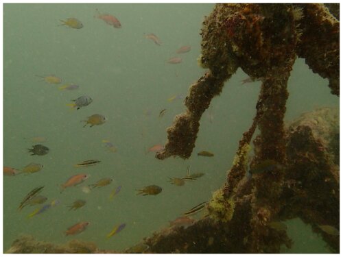 We returned to base for some lunch then headed out for the second dive below the Seaventure rig which had a much calmer start and we saw a big moray eel sticking out of a pipe, some small camouflaged fish, some lionfish and an ornate ghost pipefish (4th picture). Our new underwater camera had its first outing which was fun but we need a bit more practise!