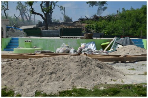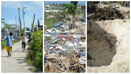 Apparently a major difference still noticeable is the loss of trees; only the sturdiest palm trees survived and even they generally only have leaves left on the side furthest from the direction the wind blew. Those which fell, either lie upturned on the beach or have been chopped up and stacked in neat piles. Dotted around the island now are little circles or arcs of pieces of wood, sticking out from the ground. Initially they look like the remnants of a children’s game until you realise they’re in fact protecting a tiny new sapling.