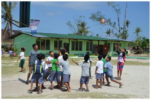 In front of her, kids were playing basketball using some new hoops that had just been donated.
