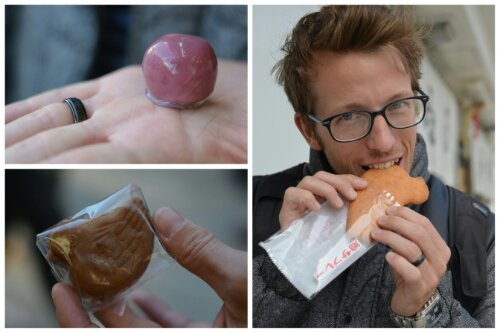 We’ve tried a few street snacks, here are some: a pigeon/duck shaped biscuit; a small cake in the same shape filled with purple soy bean paste; a strawberry flavoured ball of what we think was also soy bean paste.