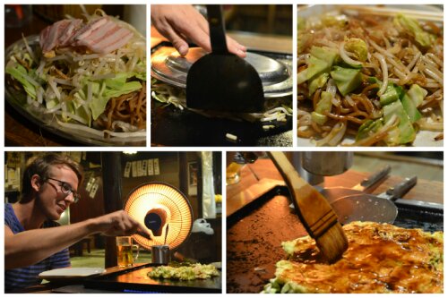 Unusually, the menu was translated into English so we picked an okonomiyaki. Raw ingredients were brought to the table and a chef showed us how to cook it: pancake-like batter, an egg, pieces of pork, cabbage and bits of tempura batter were mixed in their bowl then dropped onto the fat-smeared hot plate. It took a few minutes to cook on each side, then we put a Worcestershire-type brown sauce on top, served it up and ate it with mayonnaise. Delicious!
