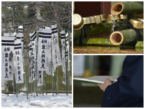 When pilgrims arrive at the temple, they first visit a water trough where they pour water on both hands then put a little in their mouth and spit to purify themselves. As they approach the shrine, they stand a foot or so behind a slatted wooden box and toss in a coin, and wish for good luck. Eyes closed, they then seem to do a combination of bows and claps before stepping aside. Some also purchase and light incense sticks, the smoke from which, they waft into their faces.