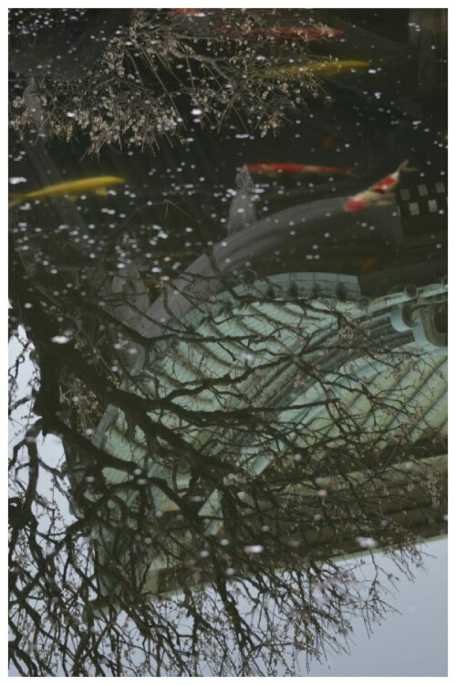 In case this is confusing, it’s a reflection of a tree and part of the temple roof plus some blossom on the surface and some carp under the water!