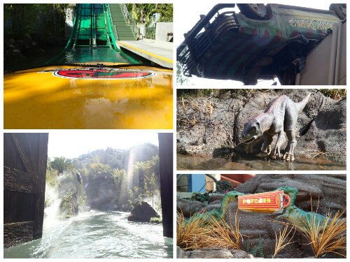 Next we strolled to the front of the Jurassic Park line. The ride first involves a boat ride (we had the front row) past lots of moving dinosaurs and jungly-ness. Towards the end there’s a small incline and a tiny descent then, inexplicably out of nowhere, an 84ft logflume drop! We got very wet but, as it was the first time we’d seen the sun in LA, we soon dried off.