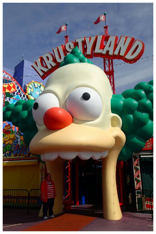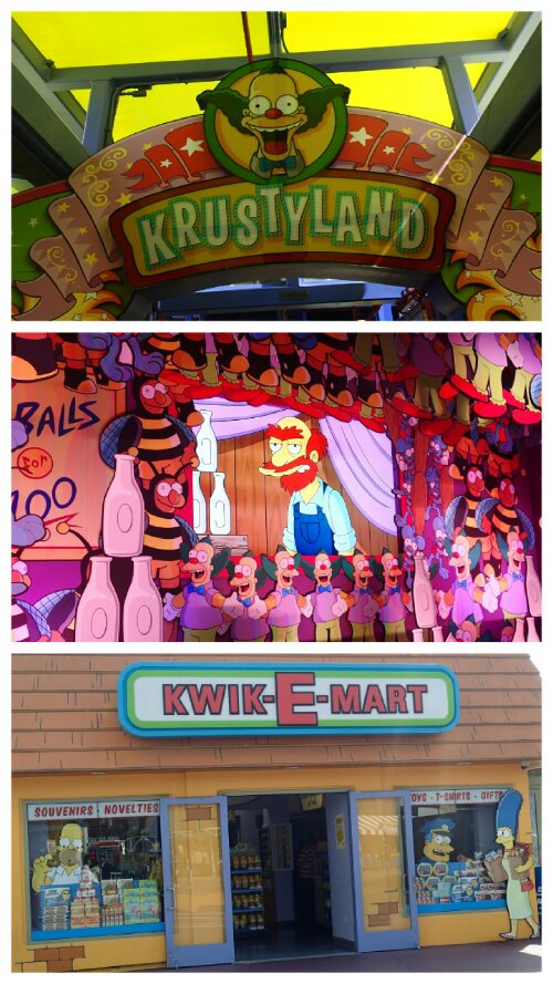 Back up the escalators we joined the line for The Simpsons ride. Set in Krustyland, this is a simulator ride through Springfield where Sideshow Bob is trying to kill the Simpsons and Maggie turns into radioactive giant and saves the day.