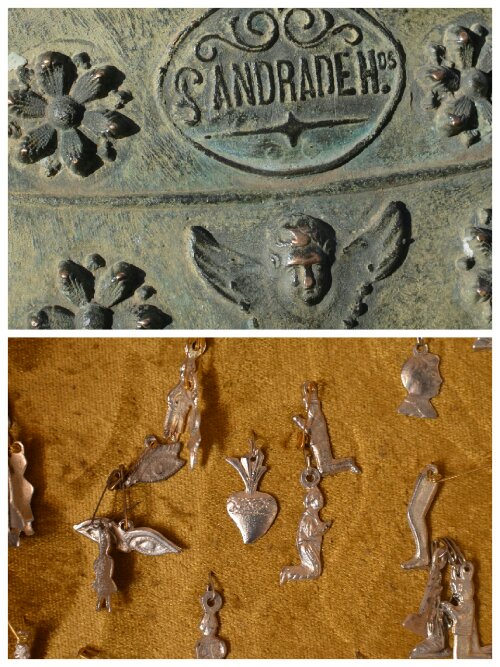 (Above is Patzcuaro’s library and Angangueo’s church; below is part of a huge retired bell from Patzcuaro’s church and the little metal representations of boday parts which locals leave at the church with their prayers.)
