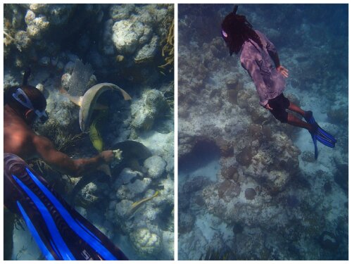 (On the left is our guide coaxing a green moray eel out using a conch.)