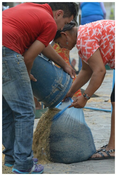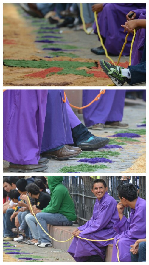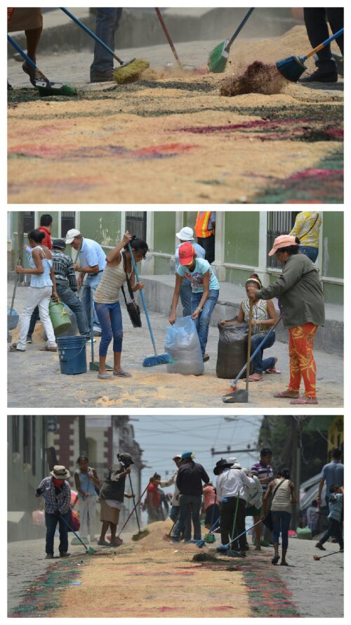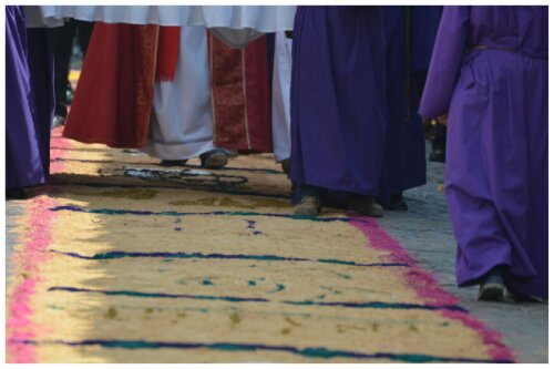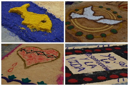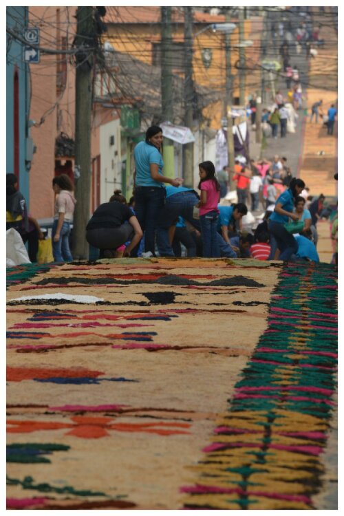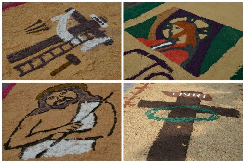 Groups of locals, each responsible for one of the fourteen ‘stations’ (where the crowds would stop to hear the sections of the story from Jesus’ arrest to His crucifixion) , begin creating the designs at 4am and many were still working on them by the time we were exploring at around 7:30. Some are made using cardboard or polystyrene stencils whilst others are sketched into the base colour by hand, using a printed picture for reference. It seemed a great community effort.