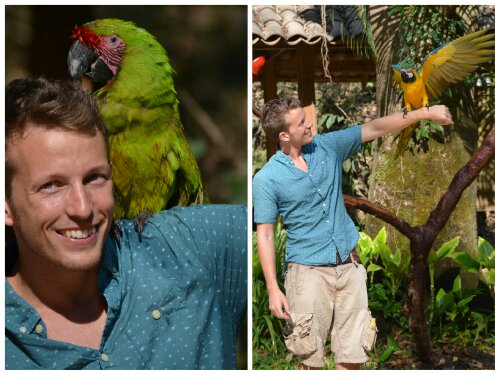 Because lots of the birds are ex-pets and thus very tame, you can also have the macaws perch on you for photographs! I didn’t dare (quite scared of birds but getting braver!) but here’s Dean and a little kid.