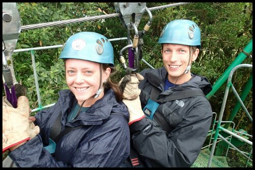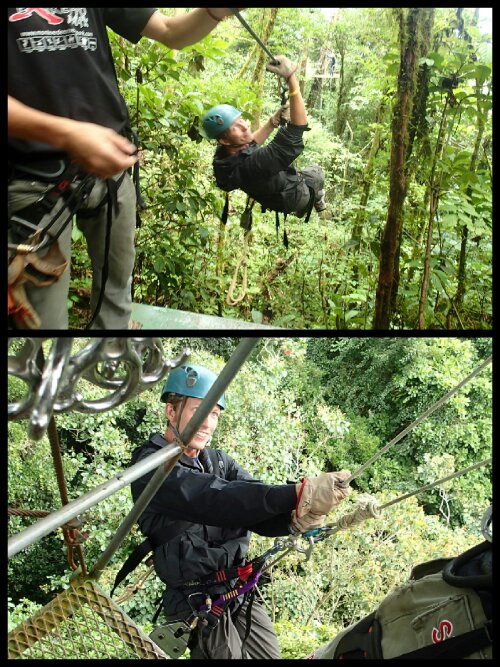 Ziplining was our wedding gift from Chantal and Wayne Moir and Mike, Helen, Hannah and Matt Rollinson. Thanks all of you! There are lots of companies to choose from but we booked our trip with Monteverde Extremo. I’d been looking forward to this adventure through the jungle canopy of Costa Rica since we first planned our trip, without giving much thought to the reality of it. There were 14 cables including 4 very long ones extending 1410 ft, 1275 ft, 1800 ft and 2250 ft. The heights of the lines were between 225 ft and 450ft and included aTarzan swing, a 90ft rappel and the ‘Superman’. These pictures are to give an impression of the scale though I’m not sure they do!