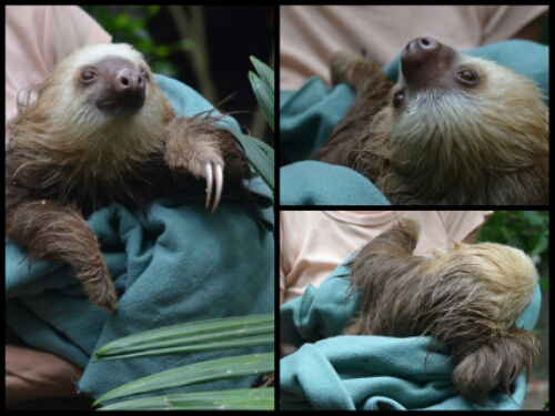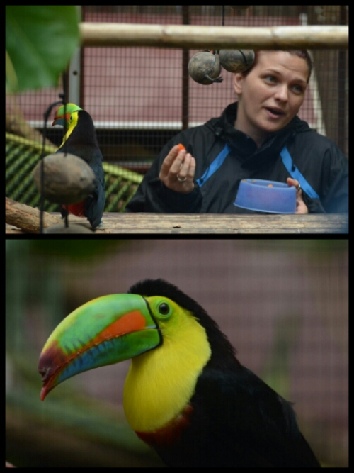 From Cahuita we travelled to Puerto Viejo De Talamanca which, for once, was a tiny journey of only about 30 minutes! It was even rainier though. We’ve spent most of our time indoors, researching South America but today we visited the Jaguar Rescue Centre. There were no jaguars: it was so called after its first ever inhabitant. But there were lots of other orphaned and injured animals and it seemed like the centre and its volunteers are doing an amazing job of releasing them back into the wild wherever possible. The only way to visit is to take a tour. This was our guide and one of her charges, Tequila the papaya-loving keel-billed toucan: