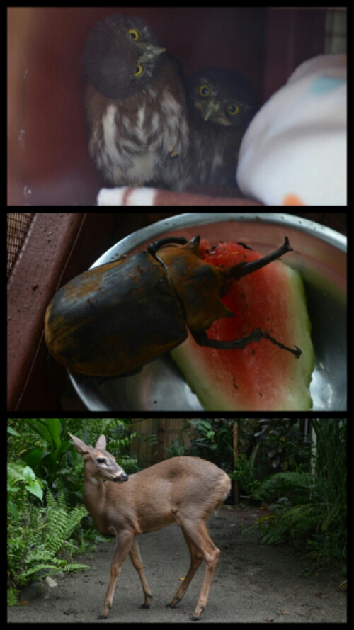 A very excitable and friendly squirrel, some new arrival baby owls, a rhinoceros beetle and one of several frolicking deer: