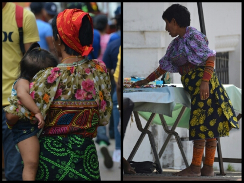 Panama City, though, is home to people from the Kuna tribe and consequently a very different type of dress. I love how colourful it is: knee-length saburet with large, bold animal print; a plainer or more intricately patterned blouse with billowy sleeves and mola panels front and back; a red and yellow headscarf (musue); a gold nose ring; short hair; and tight beaded bands (wini) from ankle to knee and on their arms too. Both men and women of the tribe seemed to be very short which even sometimes made me feel tall! As usual I wasn’t brave enough to ask anyone if I could take their picture but there are enough snaps here to give you an idea.