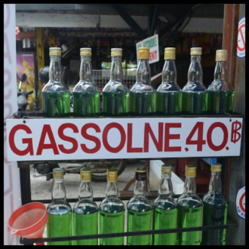 Beautiful fuengfa (bougainvillea) in clusters of pink, red, purple, white and orange cascade implausibly from the same bushes; the white and yellow flowers of frangipani trees line local gardens; and garlands of jasmine and marigolds are strung from rear-view mirrors and shrines. Open-fronted roadside restaurants, 7elevens and local shops selling bottles of green gasoline alternate with signs offering massages, laundry services and taxis. As you walk, the buzz overhead draws your eye to the dangerous-looking muddle of power cables whilst the unmistakable sewer stench brings your attention back to your feet, sometimes just as a cockroach scuttles in or out! Flags and portraits of the royals remind you how patriotic the country is.