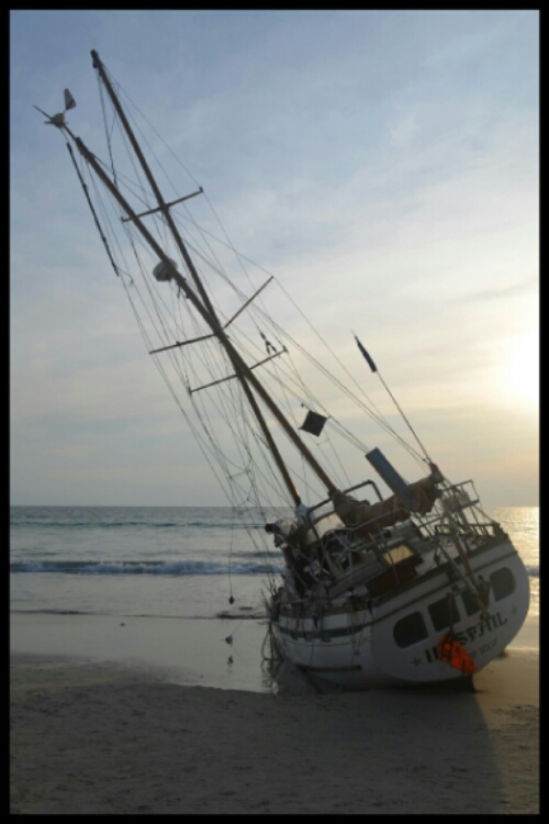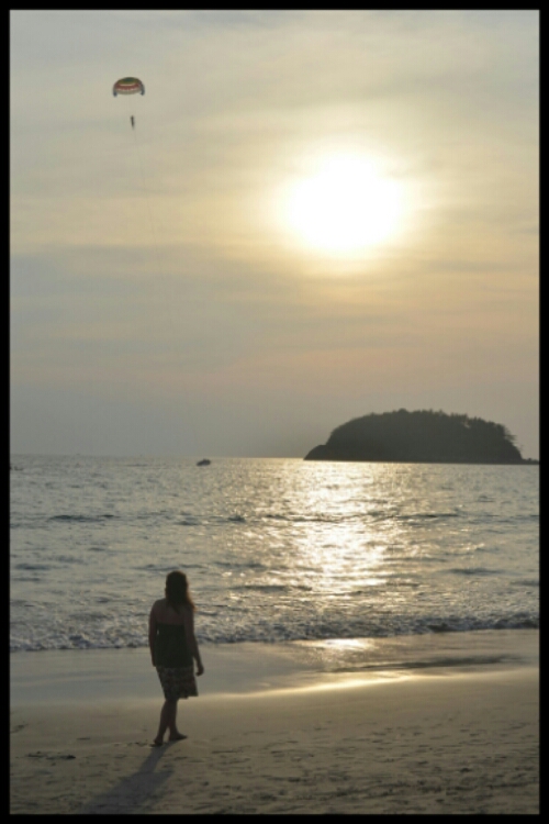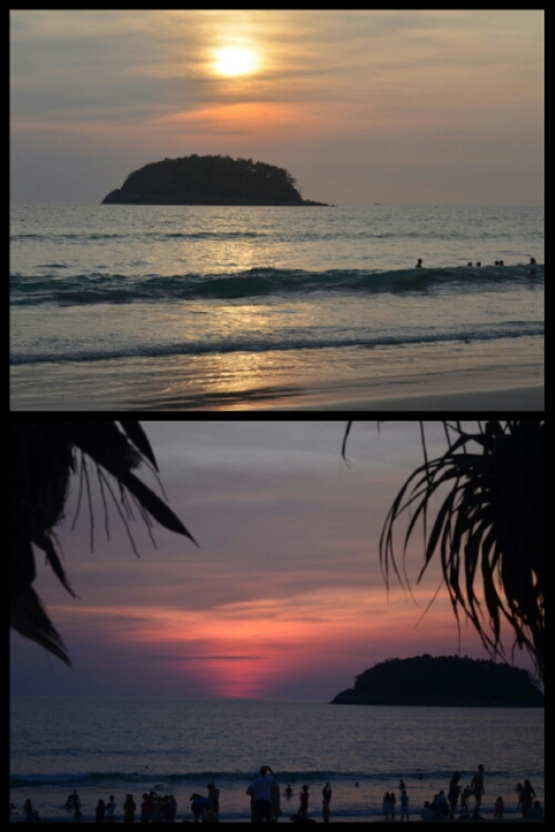 An evening stroll to big Kata beach was much busier. The parascenders are one paying tourist wearing a life jacket and strapped in, and one acrobatic lunatic just holding on to a couple of straps! The inconveniently beached boat is from the Scilly Isles, bought by some Australians in Ranong, sailed to Phuket, anchored at sea and swept in by a small storm. The Australians have now sold it and left; salvage attempts continue!