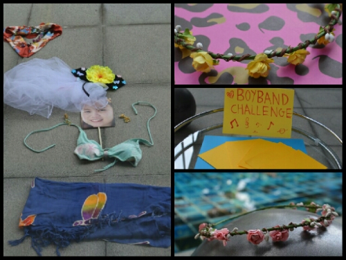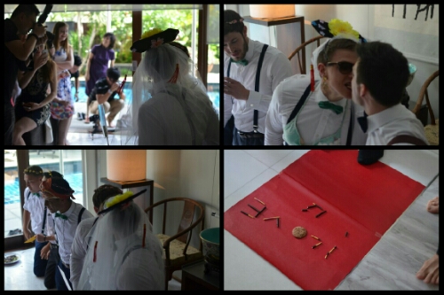 The Boyband Challenge was next. Harry drew from a pile of five cards, selecting a groomsman to receive each one. Adam was given squats, Jerome had to dance on decreasing sizes of paper, Jake was blind-folded, Pete held an exercise ball between his knees and James was dressed up as Ting for Harry to serenade! In addition they were all given fetching floral headwear to put on. An extra dimension was added to the task in that their performance was to take place on a narrow patio alongside the swimming pool!