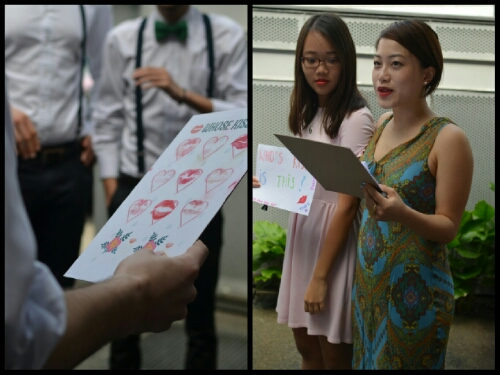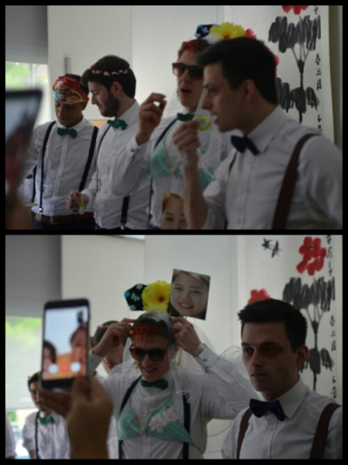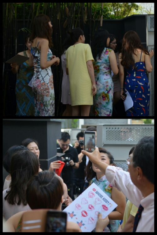 Li Lin and the other bridesmaid, Xiang, introduced the event officially and game one began. It was called Whose Lips are These? and I suppose it was pretty self-explanatory, however the penalty for each incorrect answer was that red lipstick would be applied to a groomsman!