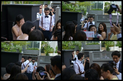 It wasn’t a very private affair, with four photographers on one side of them and a sizeable crowd on the other, but nevertheless it was a very romantic moment. Ting looked stunning in her elegant, floral cheongsam, every bit the princess.