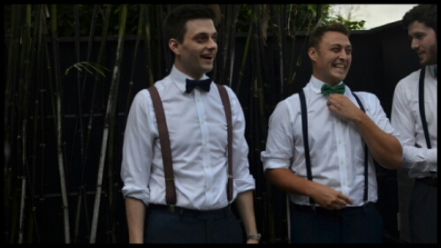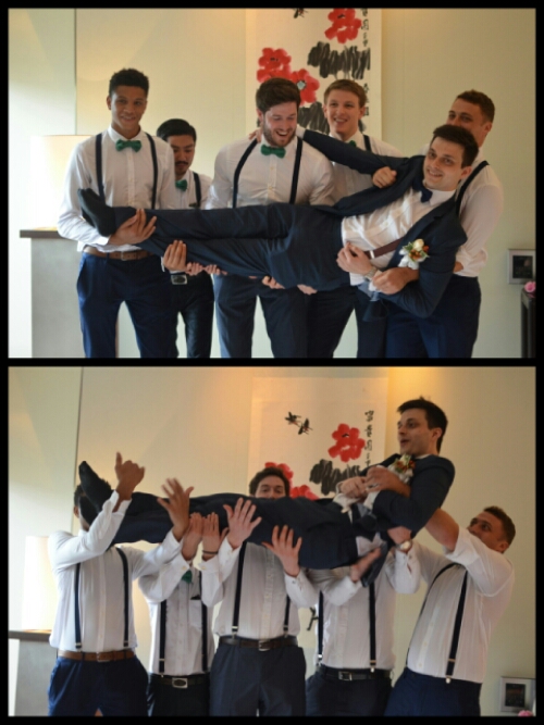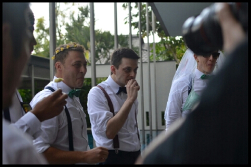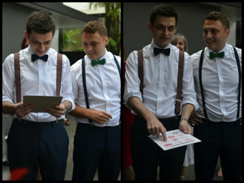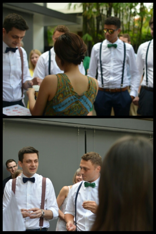 For game number three, we headed indoors. The groomsmen and Harry were made to kneel in a line with the hands behind their backs. At Adam’s end was a bowl of piecs of Pocky sticks and at Harry’s was a sheet of paper. The challenge was for Harry to spell out I Love You with sticks passed down the line before the song ran out. To be honest, he aced it! So with another win in the bag, and all groomsmen still intact, all that remained was for them to eat their third treat (not sure what it was).