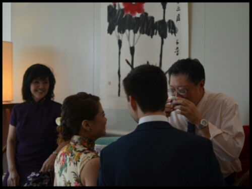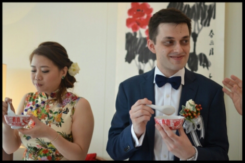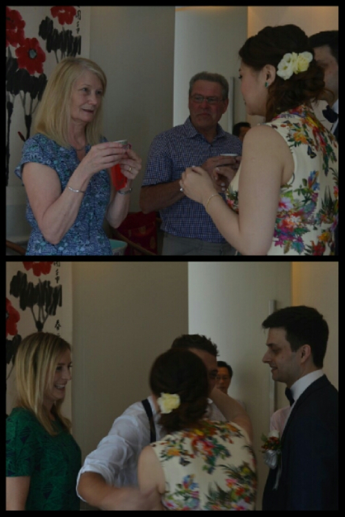Li Ling, compering the ceremony, invited Ting’s grandparents to sit in chairs in front of everyone. Harry, on the right, and Ting then kneeled on cushions and took small porcelain teacups from a tray. Ting presented hers to her grandmother and Harry gave his to her grandfather. In return, as is customary, Harry and Ting were handed a red envelope (an hóngbāo) which is a monetary wedding gift, again ending in an eight.