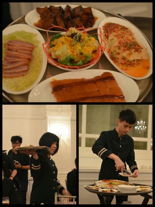 The tables were set with cutlery, chopsticks, glasses, traditional handle-less teacups and an assortment of unidentified condiments in dishes. The flower centrepieces appeared to float above the table on tall glass vases. Denoted by a whole other level of opulence, next to us was the ‘VIP’ table featuring the newlyweds, their parents, Ting’s grandparents, Adam, Yi Ming and Li Lin.