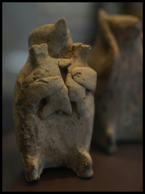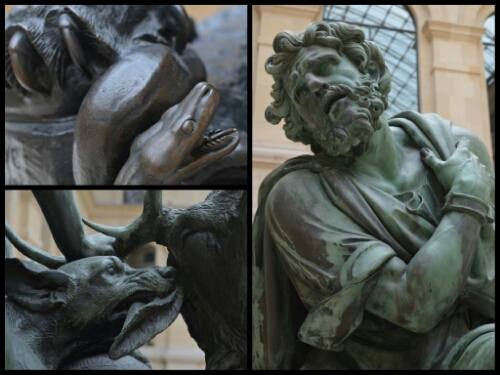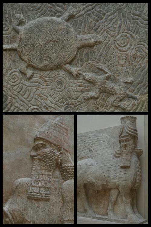 Then we wandered around a bit more, saw the apartments of Napoleon III and lots of sculpture plus these wall carvings and giant winged human-headed bulls from an Assyrian court (which have five legs – four from the side yet still two from the front).