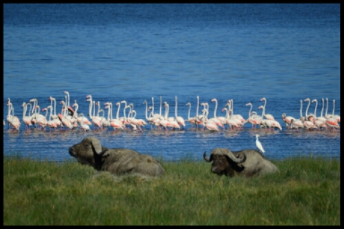 The lake became famous due to millions of migrating flamingos. However recent years’ high water levels have meant they’ve had to adopt another lake. A select hardcore few came anyway. Just behind the flamingos with the buffalos were a pair of hippos!