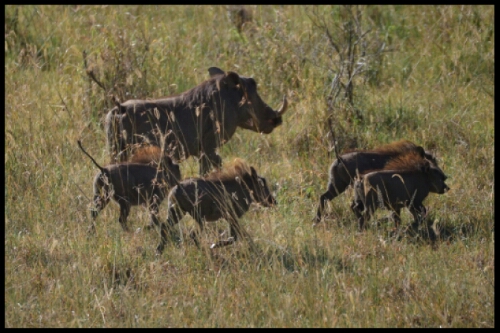 A family of shy portly warthogs, trotting about, seeing to business.